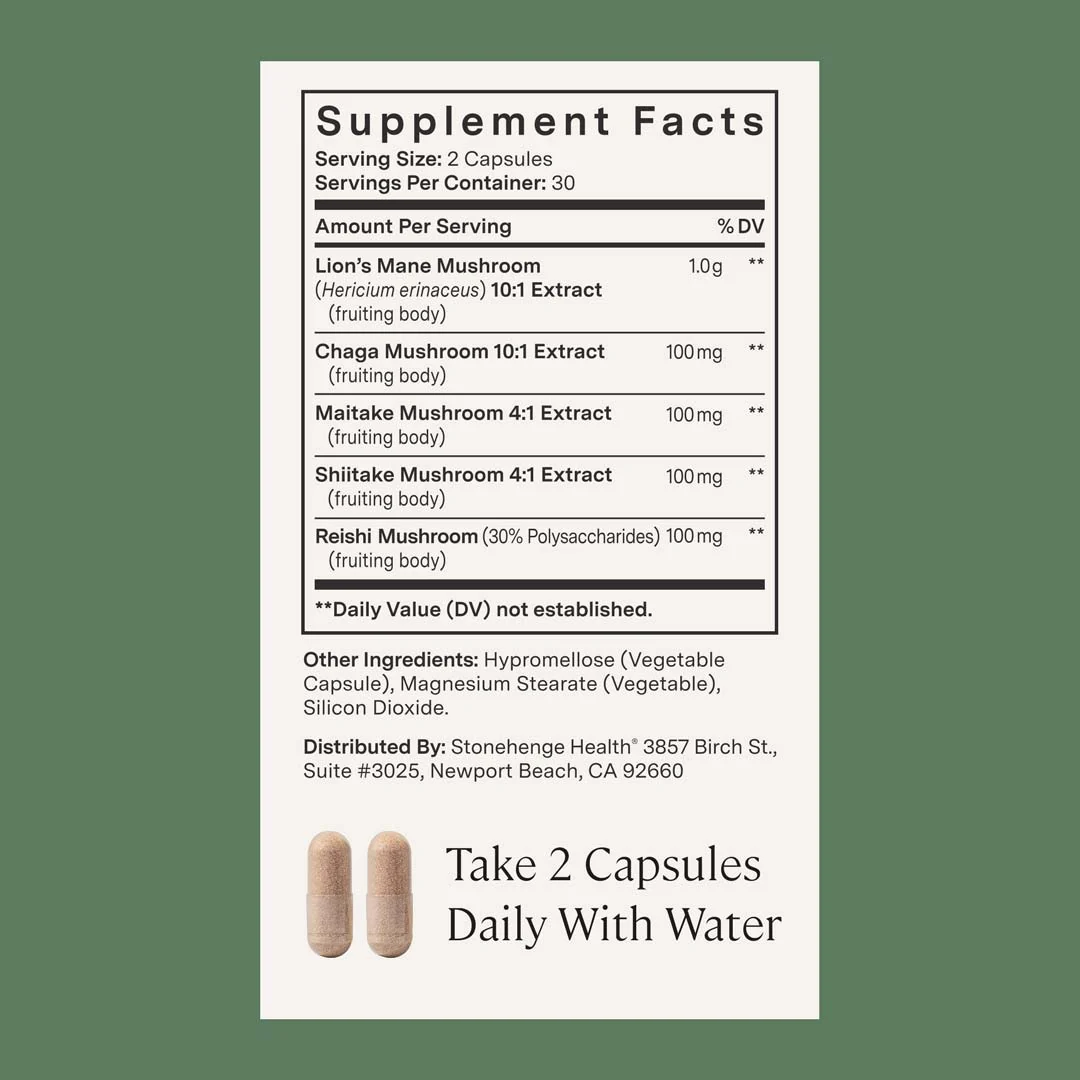 Stonehenge Health's Dynamic Mushrooms is a concentrated 1,400 mg blend of some of the world's most researched mushrooms: Lion's Mane, Reishi, Chaga, Shiitake, and Maitake. Each of these mushrooms has its health-promoting ability. Together, they are a powerhouse nootropic formulation designed to support healthy cognitive function, ease stress, and promote happiness and motivation. This quality supplement can also help support immune health and healthy digestion.